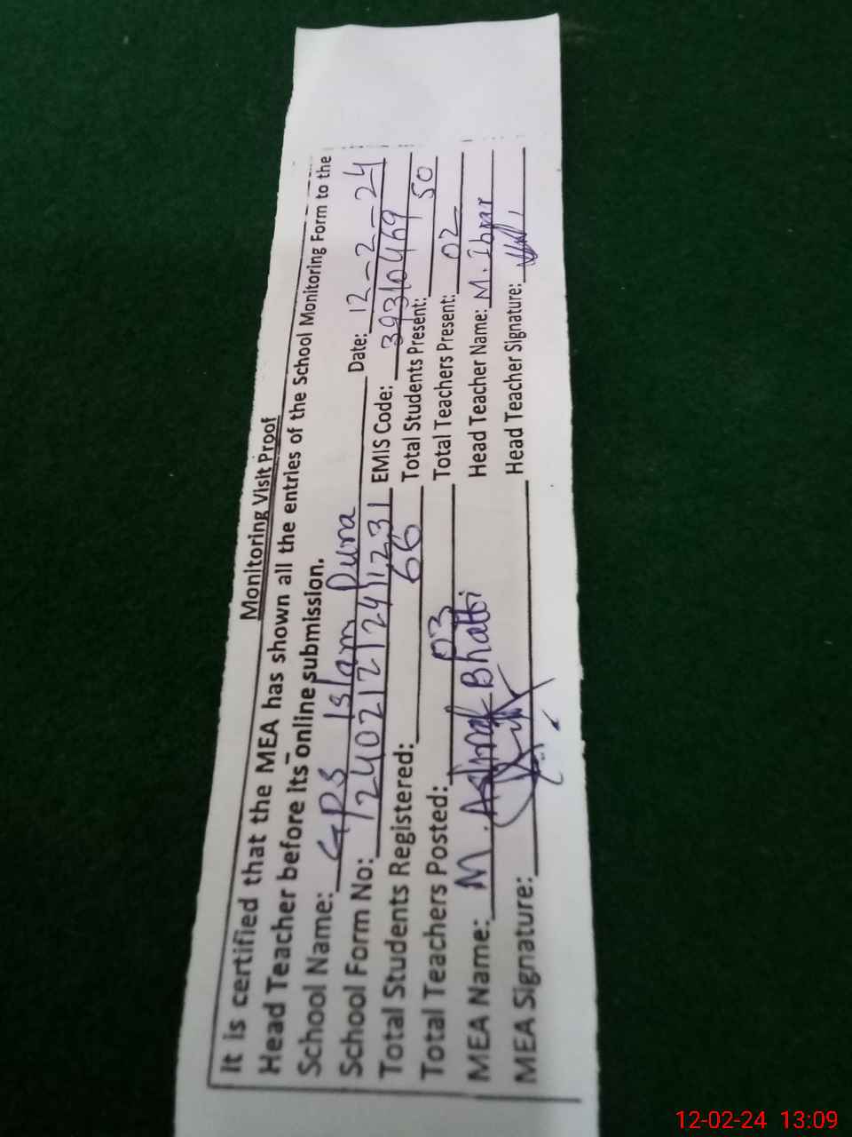 | Attendance Register | Head Teacher | MEA with School | Visit Proof |