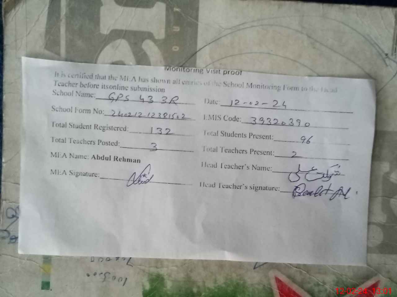 | Attendance Register | Head Teacher | MEA with School | Visit Proof |