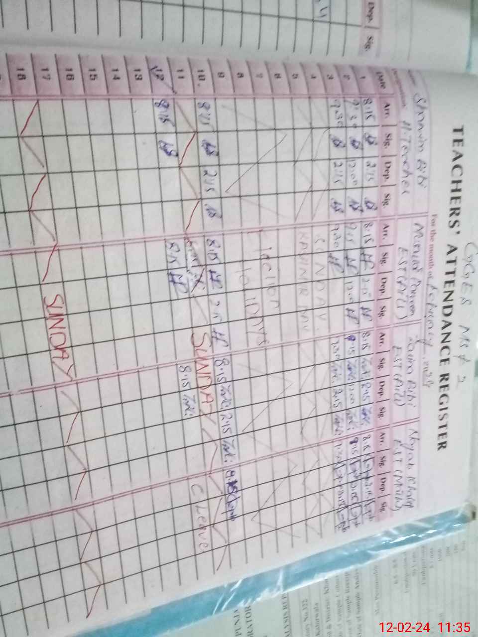 | No. of Students Present - Female | 0 | 0 | 30 | 24 | 17 | 16 | 29 | 24 | 18 | 14 | 11 | 183 | ||||