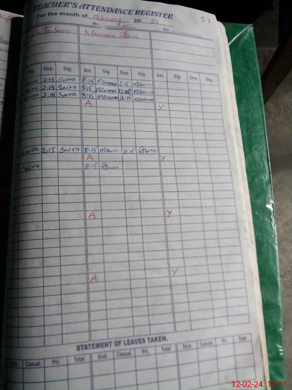 | Leave | Duty | Absent | Maternity | Medical | Ex- Pak |