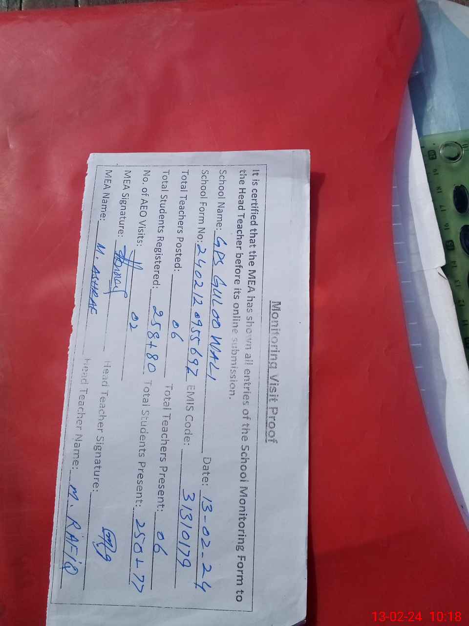 | EMIS Code: 31310179 | Name of School: GPS GULOOWALI (After Noon) | |||