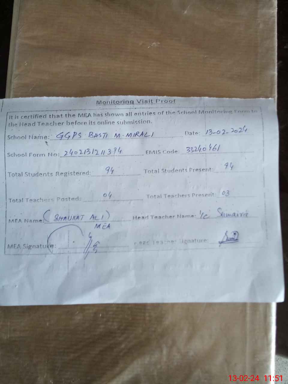 | Attendance Register | Head Teacher | MEA with School | Visit Proof |
