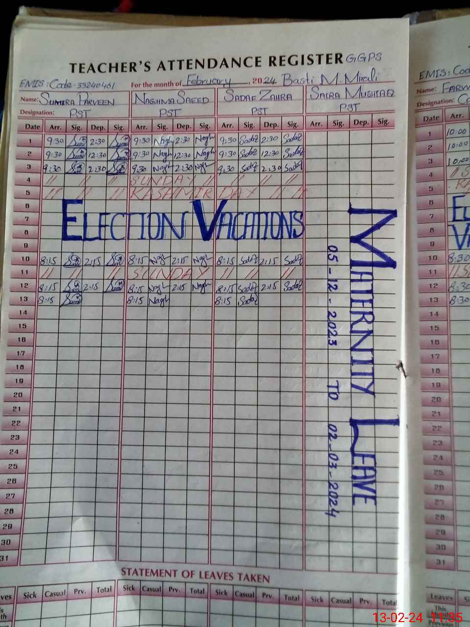 | 36**** | Sa**** Mu**** | 1 | 31 | 0 | 0 | 31 | 0 | 0 | 0 | 0 | 0 | Maternity | |