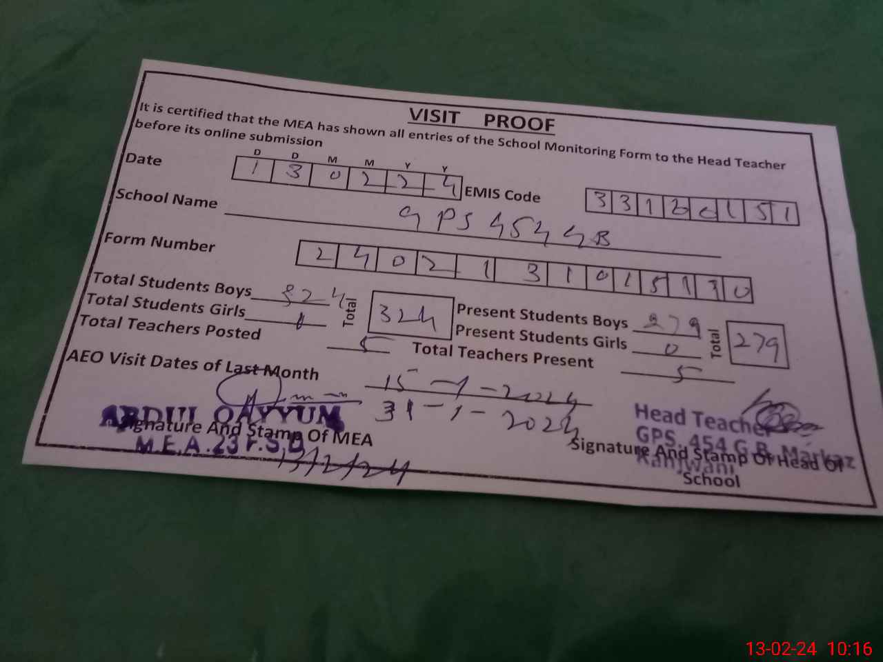 | Attendance Register | Head Teacher | MEA with School | Visit Proof |