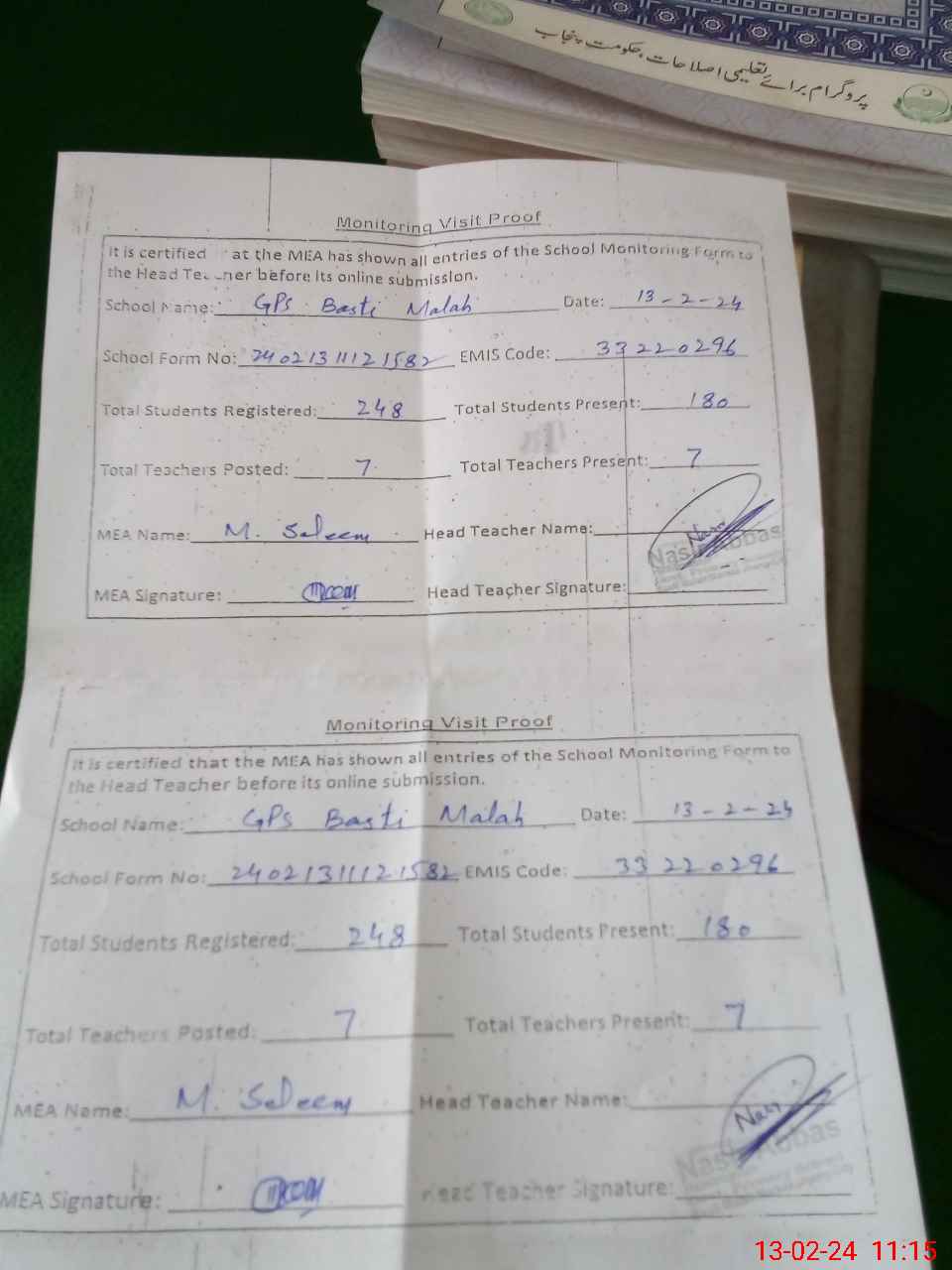 | Attendance Register | Head Teacher | MEA with School | Visit Proof |