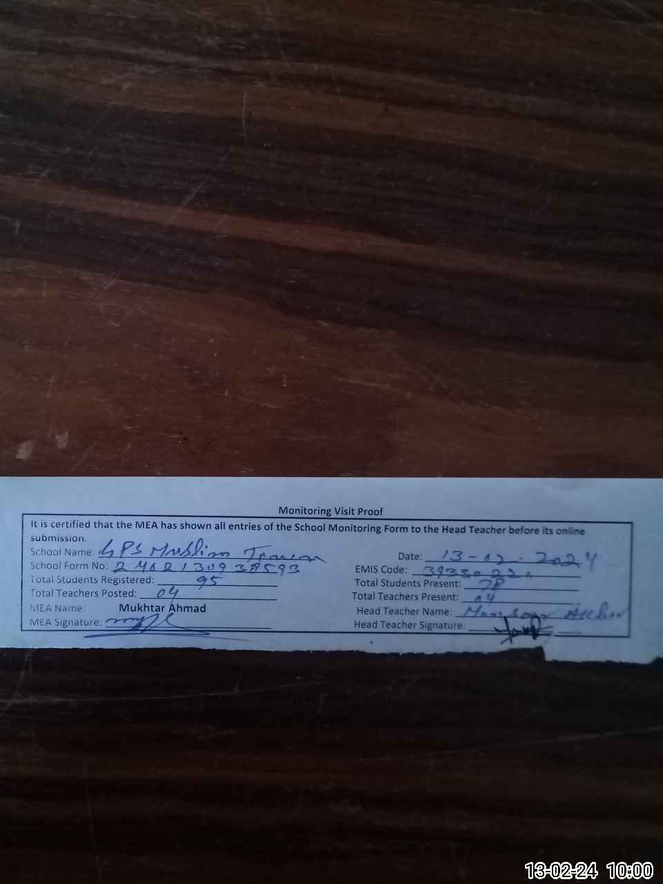 | Attendance Register | Head Teacher | MEA with School | Visit Proof |