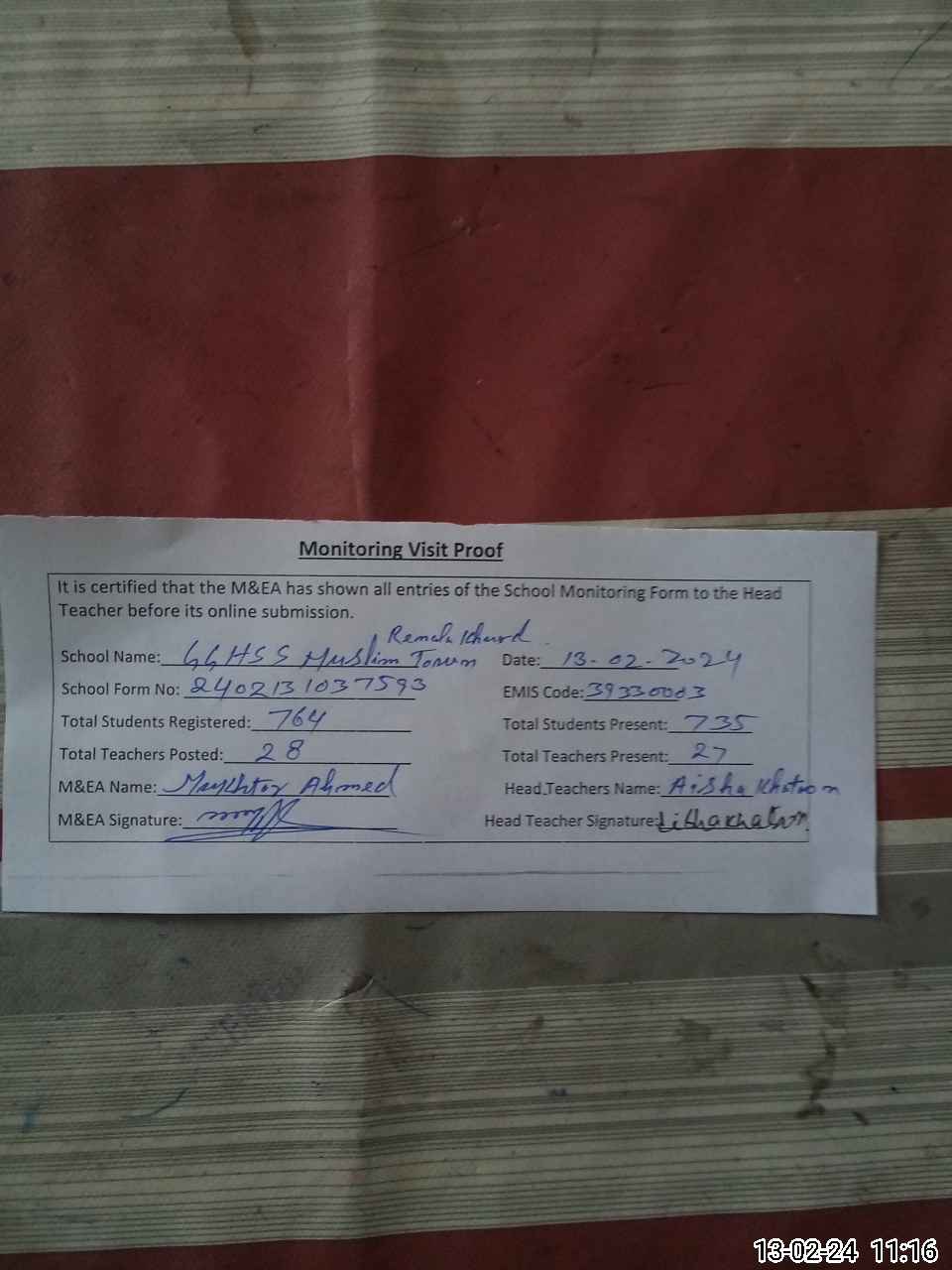 | Attendance Register | Head Teacher | MEA with School | Visit Proof |