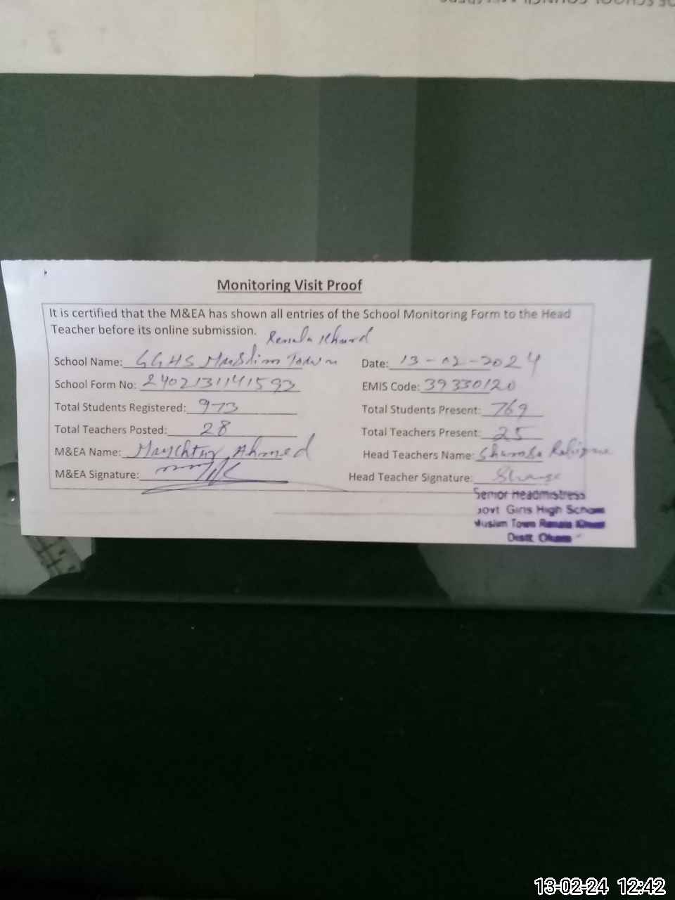 | EMIS Code: 39330120 | Name of School: GGHS MC MUSLIM TOWN RENALA KHURD | |||