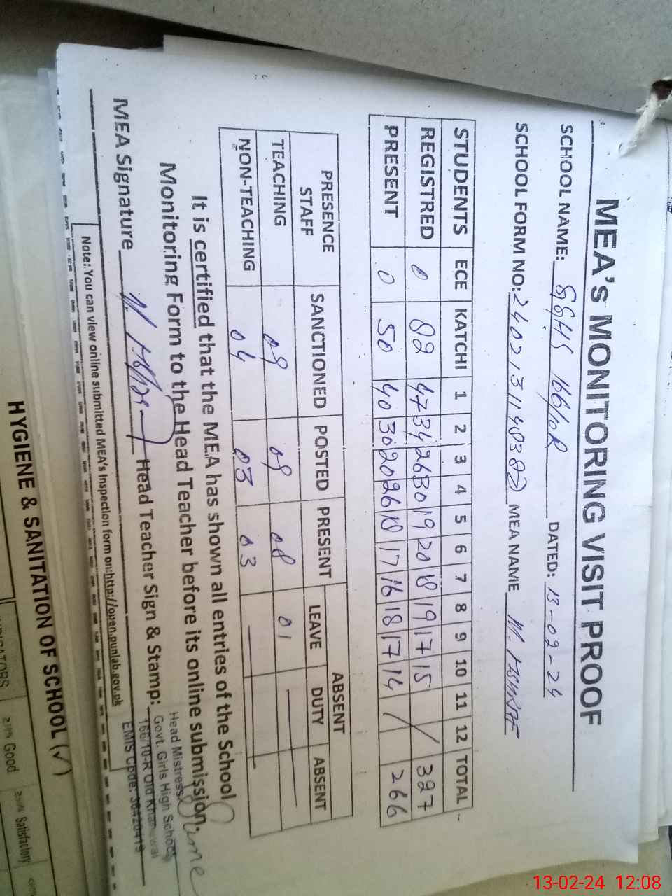 | Attendance Register | Head Teacher | MEA with School | Visit Proof |