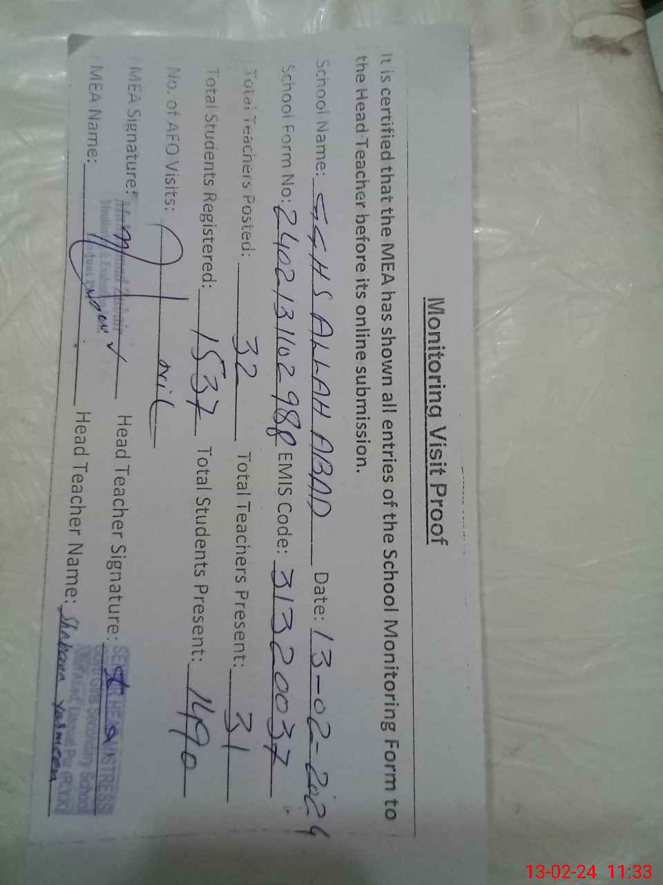 | EMIS Code: 31320037 | Name of School: GGHS ALLAH ABAD | |||
