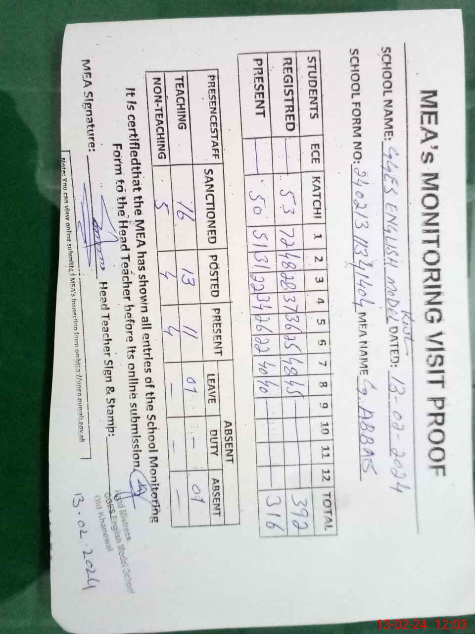 | Attendance Register | Head Teacher | MEA with School | Visit Proof |