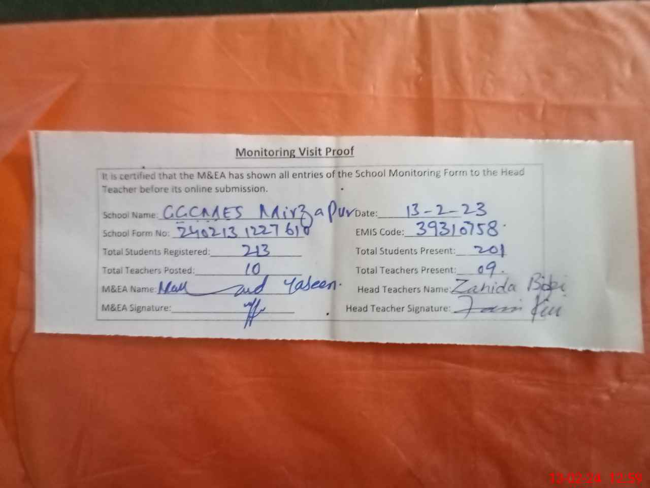 | Attendance Register | Head Teacher | MEA with School | Visit Proof |