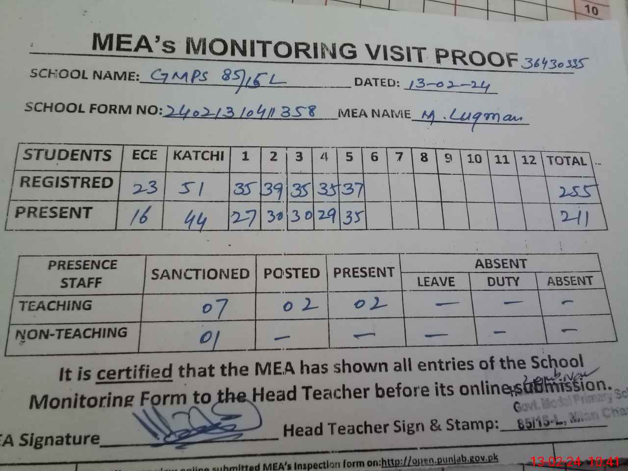 | Certified that this School was Inspected by the Undersigned MEA/DMO Today and the Information Stated Above is as Per Record. | |||||
