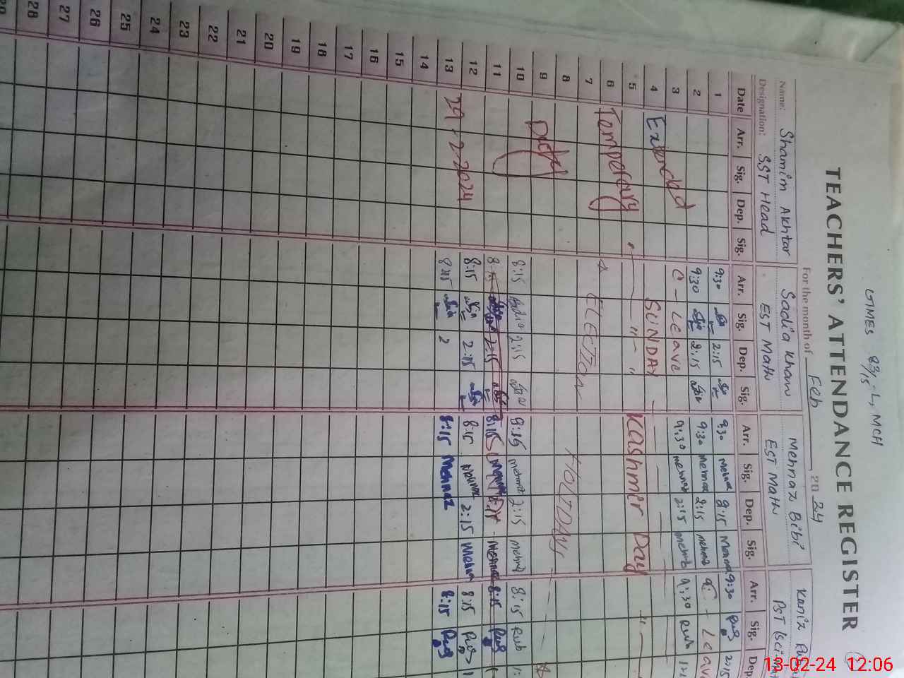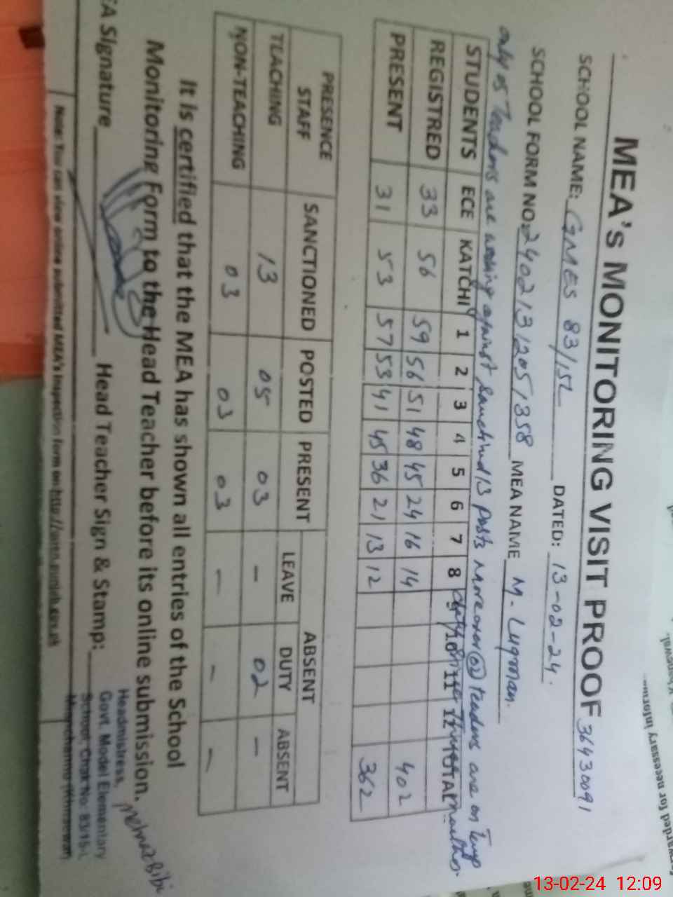 | Remarks (Use Separate Page if Required): Total enrollment of students is 402 Total sanctioned posts are 13 and only 05 posts are filled 02 teachers are on temporary adjusted in other school from more than three months | |||||