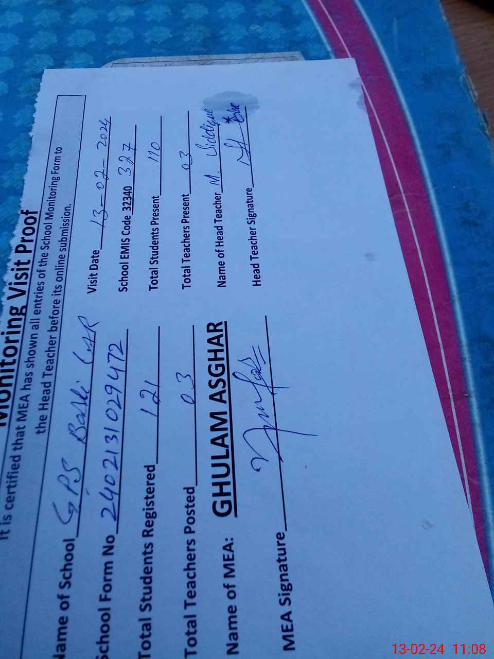 | Attendance Register | Head Teacher | MEA with School | Visit Proof |