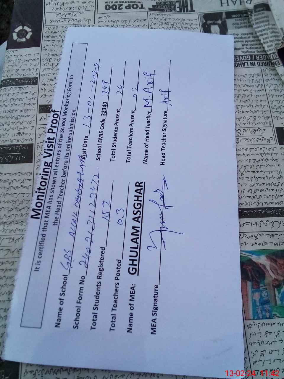 | Attendance Register | Head Teacher | MEA with School | Visit Proof |