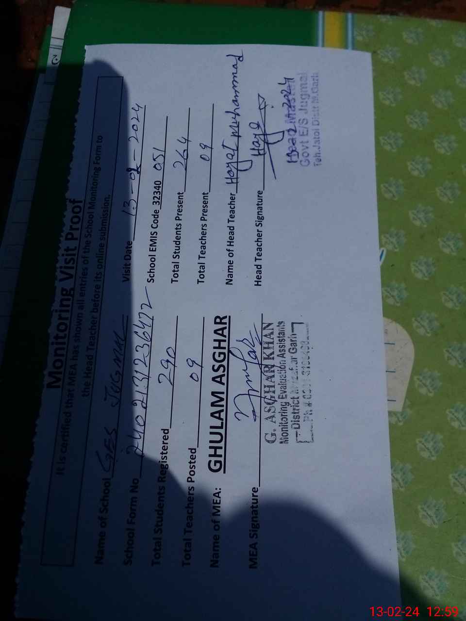 | Attendance Register | Head Teacher | MEA with School | Visit Proof |
