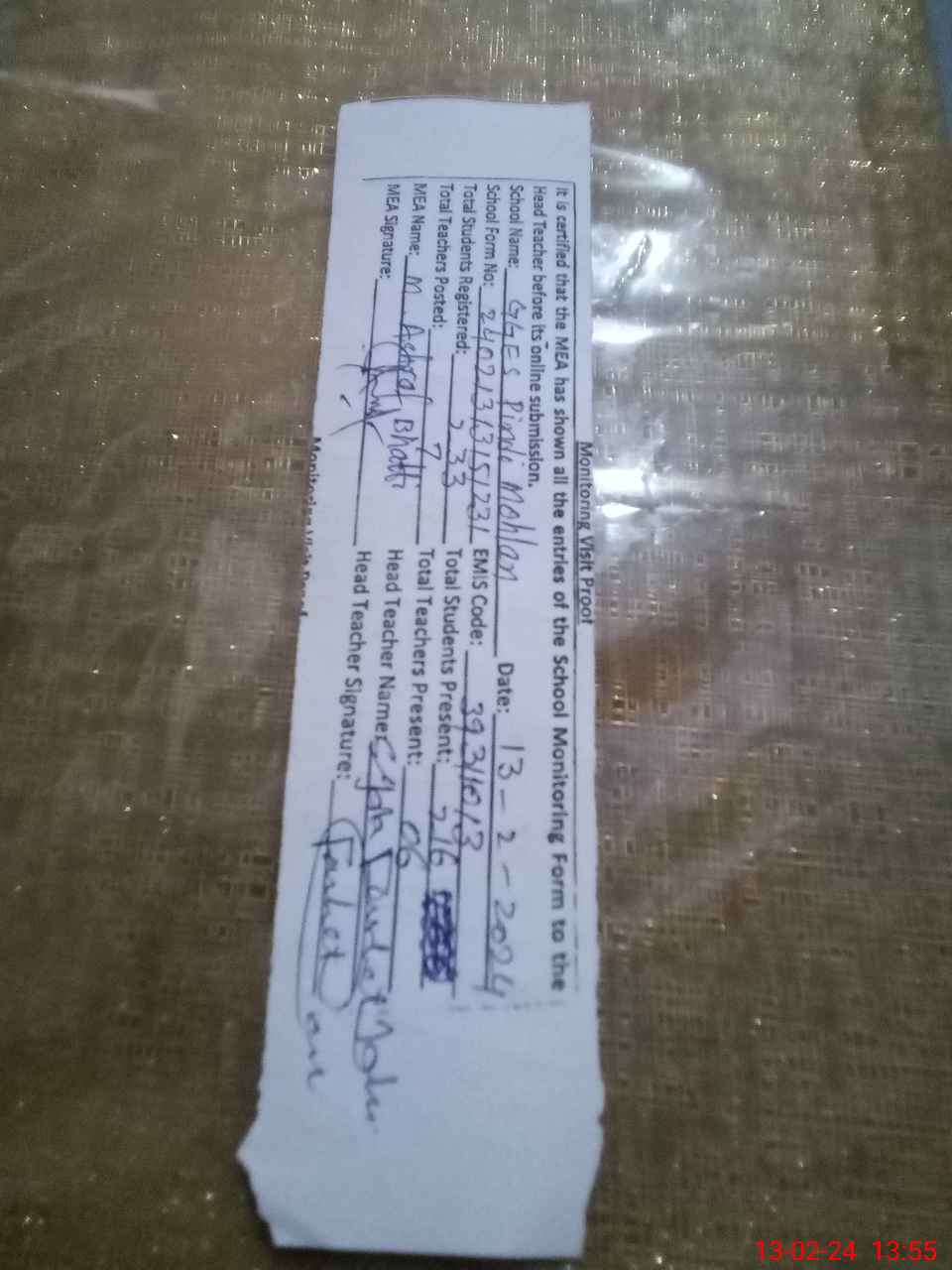 | Attendance Register | Head Teacher | MEA with School | Visit Proof |