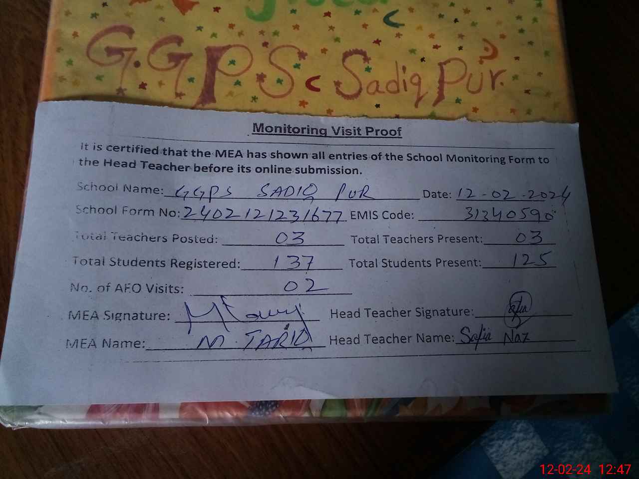 | EMIS Code: 31340590 | Name of School: GGPS SADIQ PUR | |||