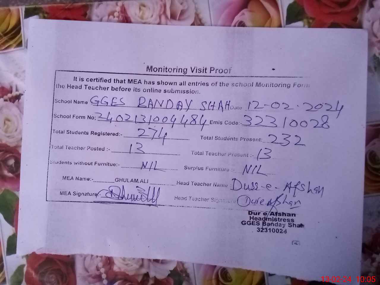 | Name: DU**** EAF**** Designation: (School Headmaster's/Headmistress's) S.S.T.(Sc) Phone/Cell Number: 03**** |