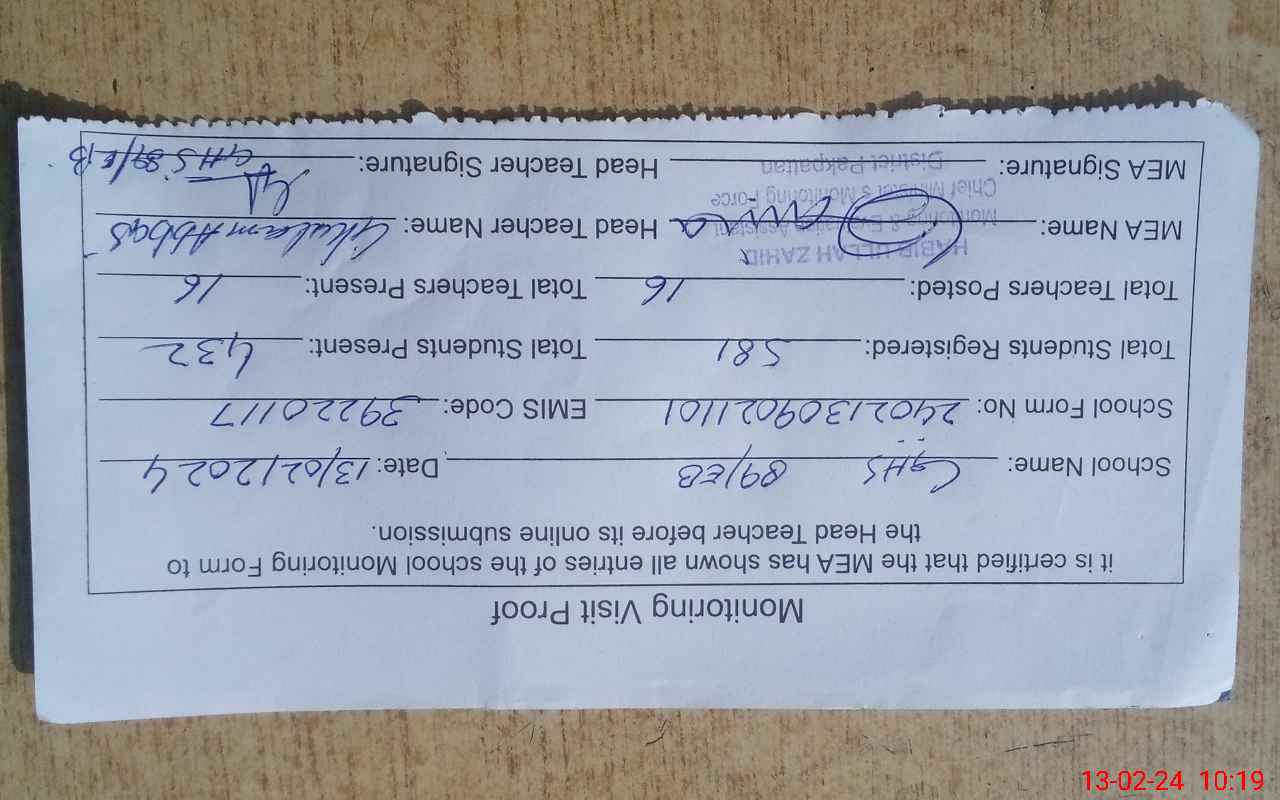 | EMIS Code: 39220117 | Name of School: GHS CHAK NO. 89 EB | |||
