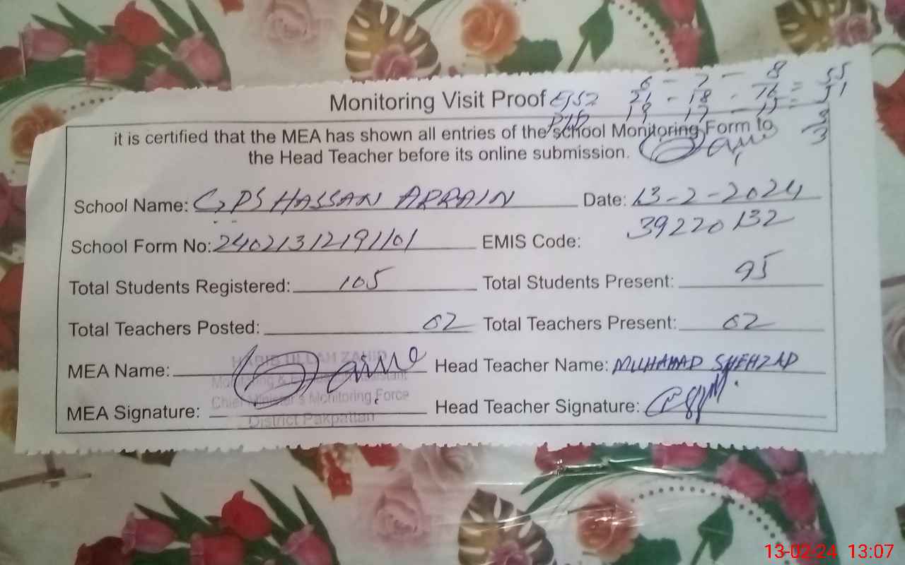 | EMIS Code: 39220132 | Name of School: GPS CHAK HASSAN ARRAIN | |||