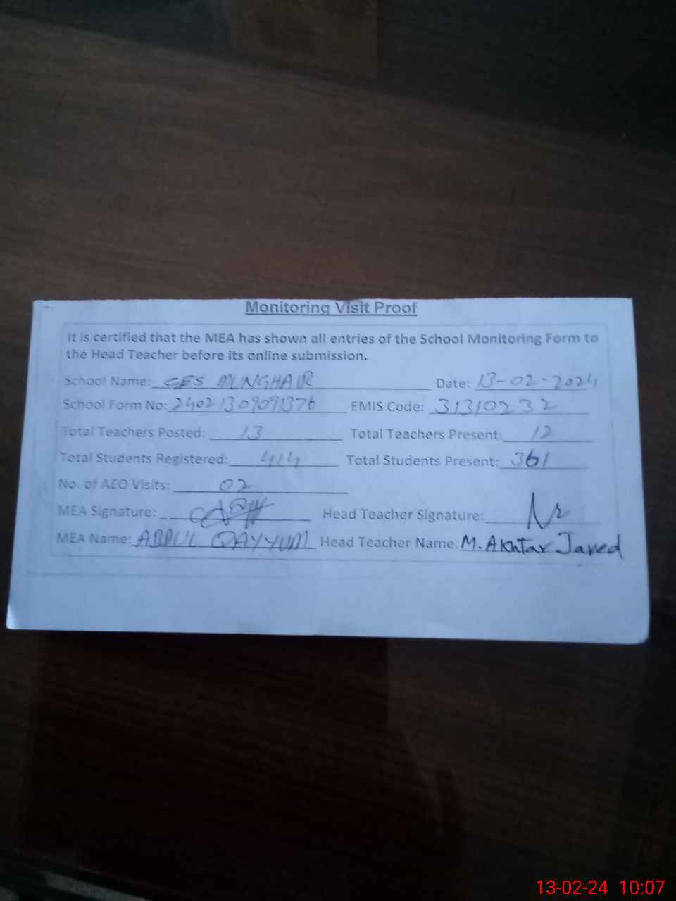 | Certified that this School was Inspected by the Undersigned MEA/DMO Today and the Information Stated Above is as Per Record. | |||||