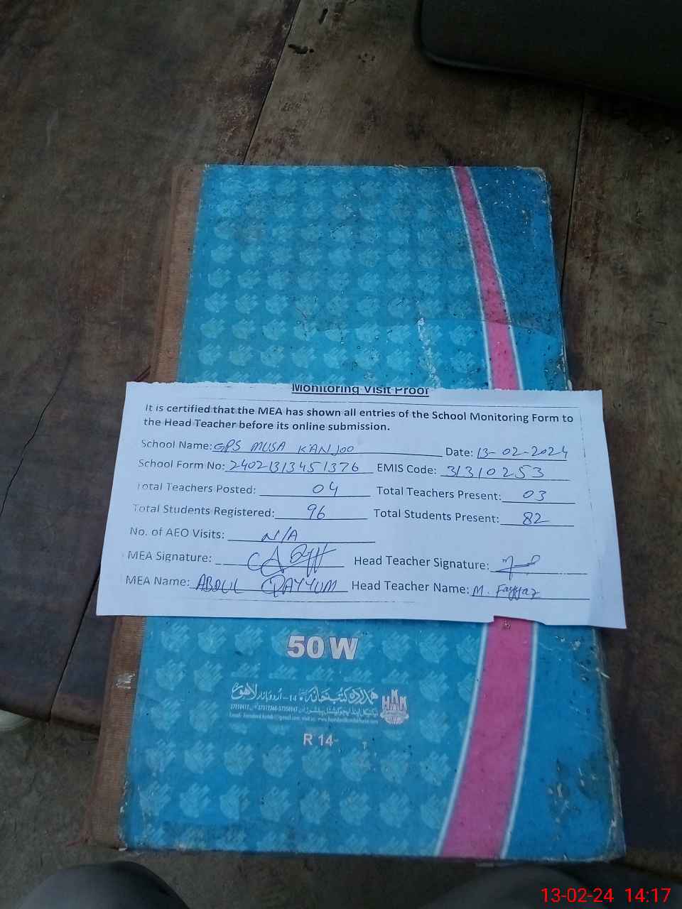 | Attendance Register | Head Teacher | MEA with School | Visit Proof |