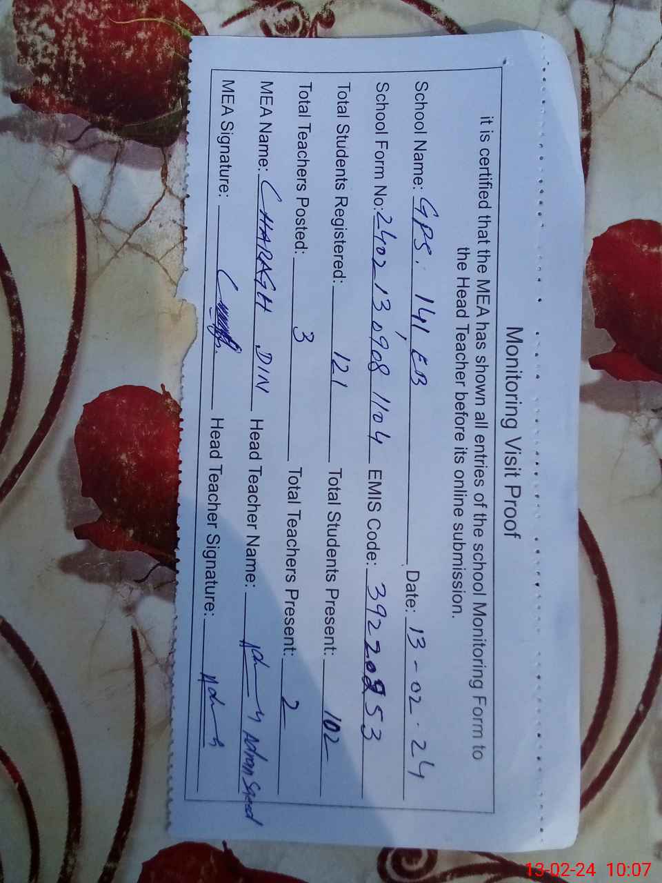 | Attendance Register | Head Teacher | MEA with School | Visit Proof |
