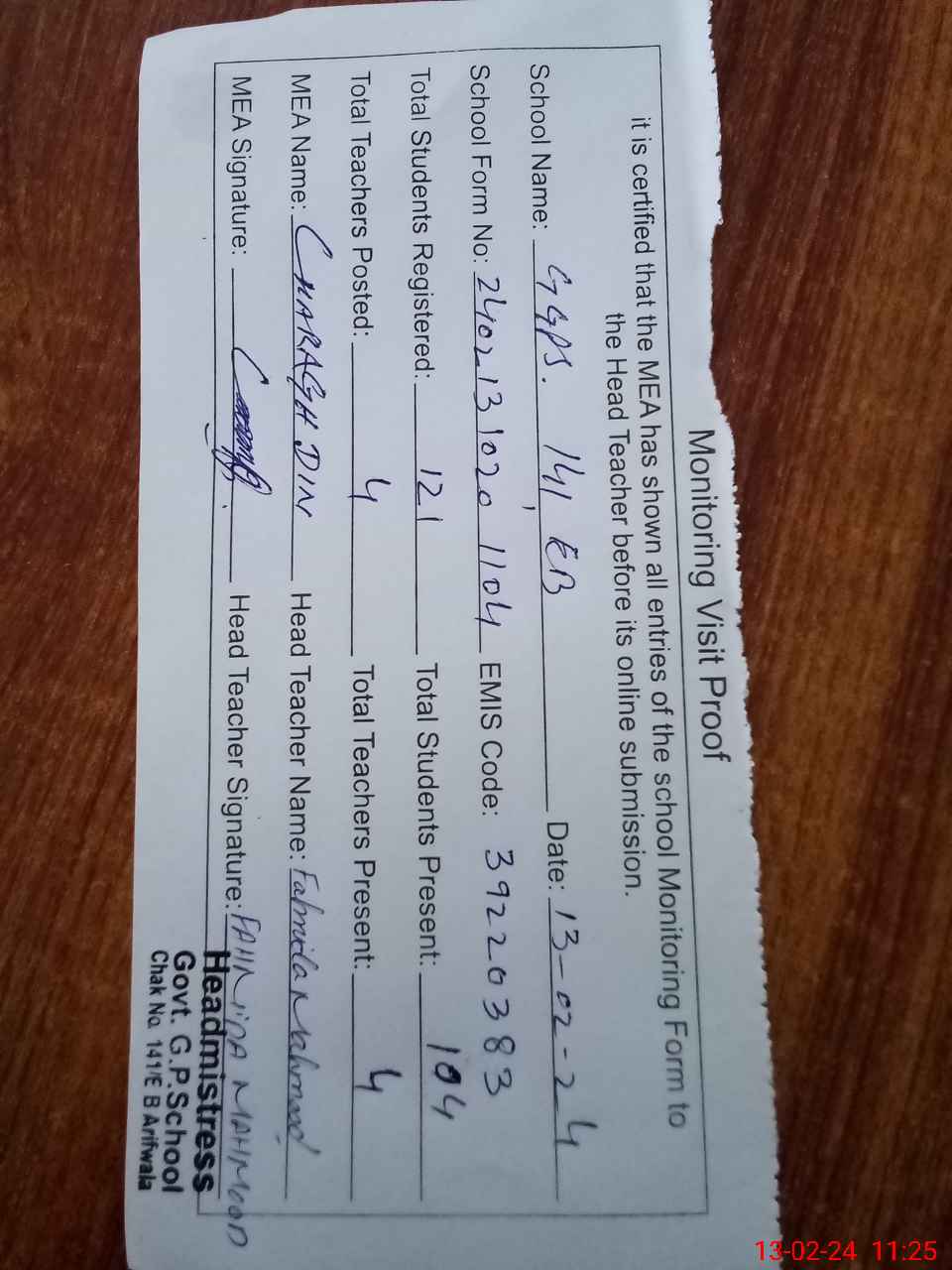 | Attendance Register | Head Teacher | MEA with School | Visit Proof |