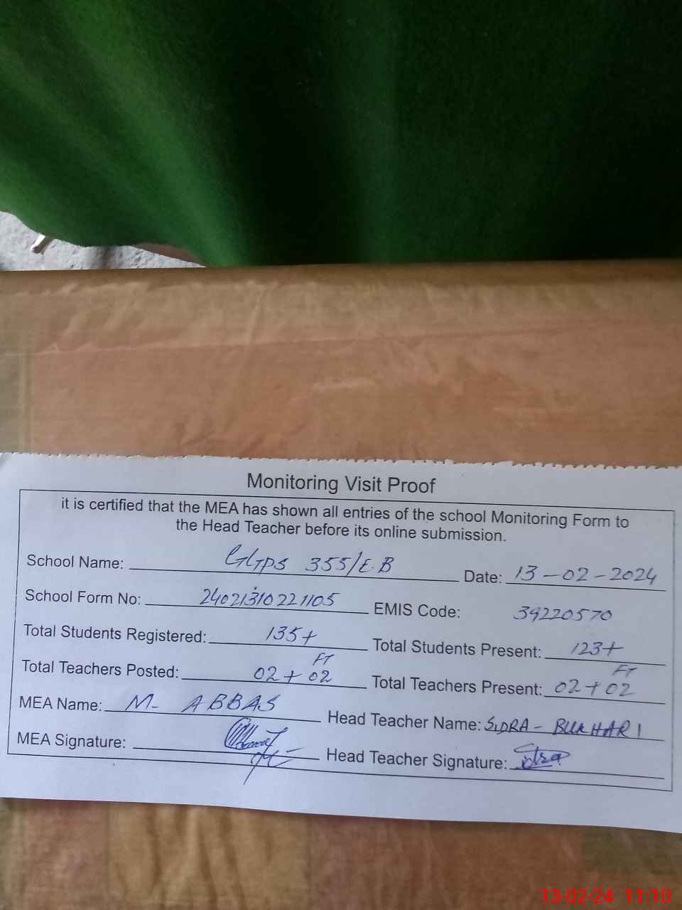 | Attendance Register | Head Teacher | MEA with School | Visit Proof |