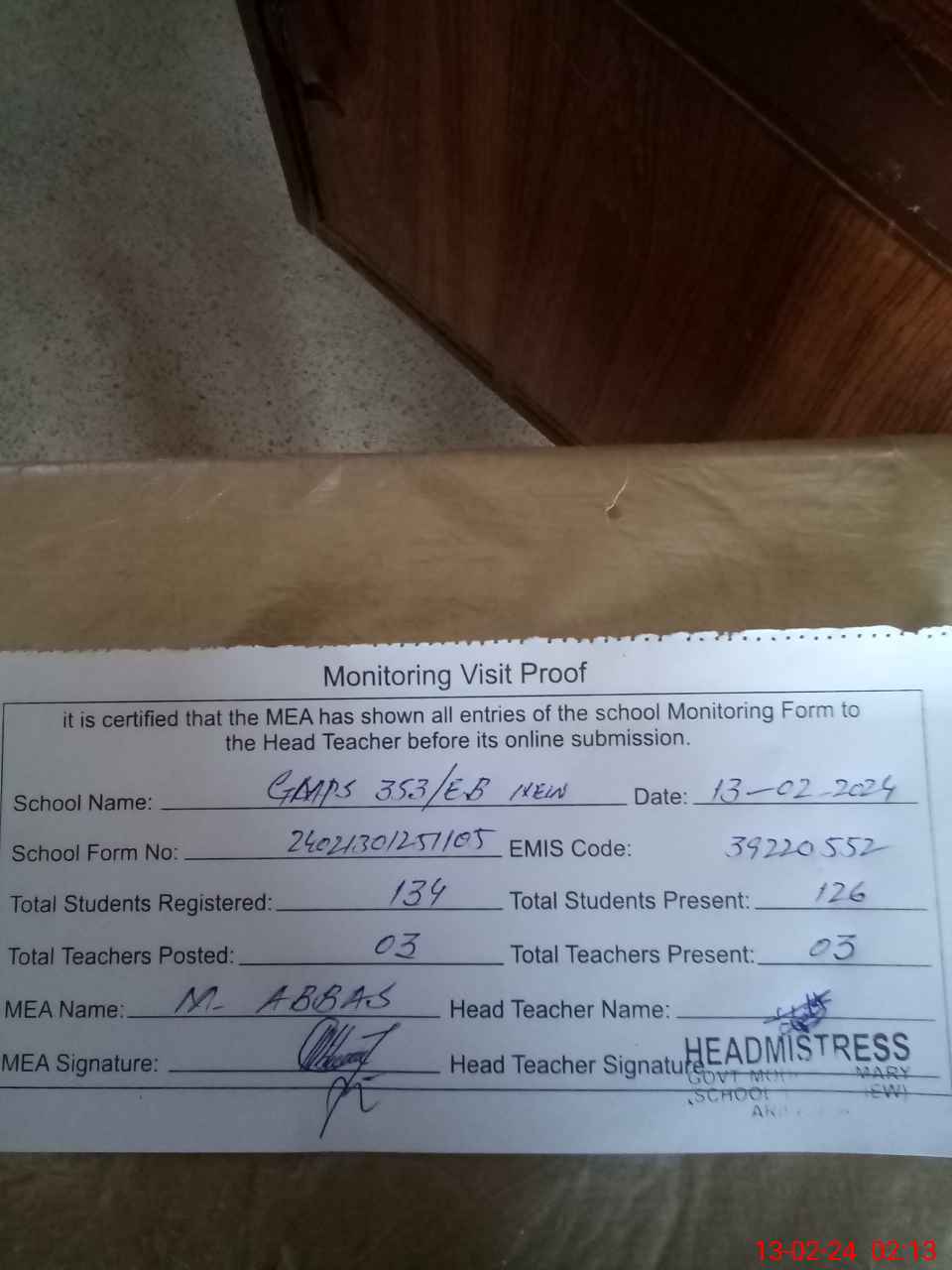 | Attendance Register | Head Teacher | MEA with School | Visit Proof |