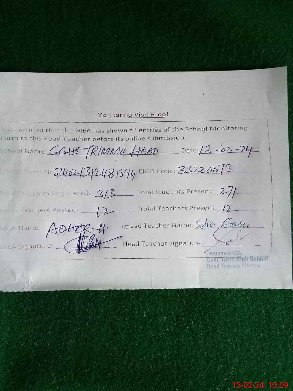 | Attendance Register | Head Teacher | MEA with School | Visit Proof |