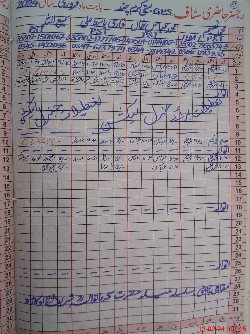 | CNIC | Full Name | Designation | R/C | Absence During Last Calender Month |