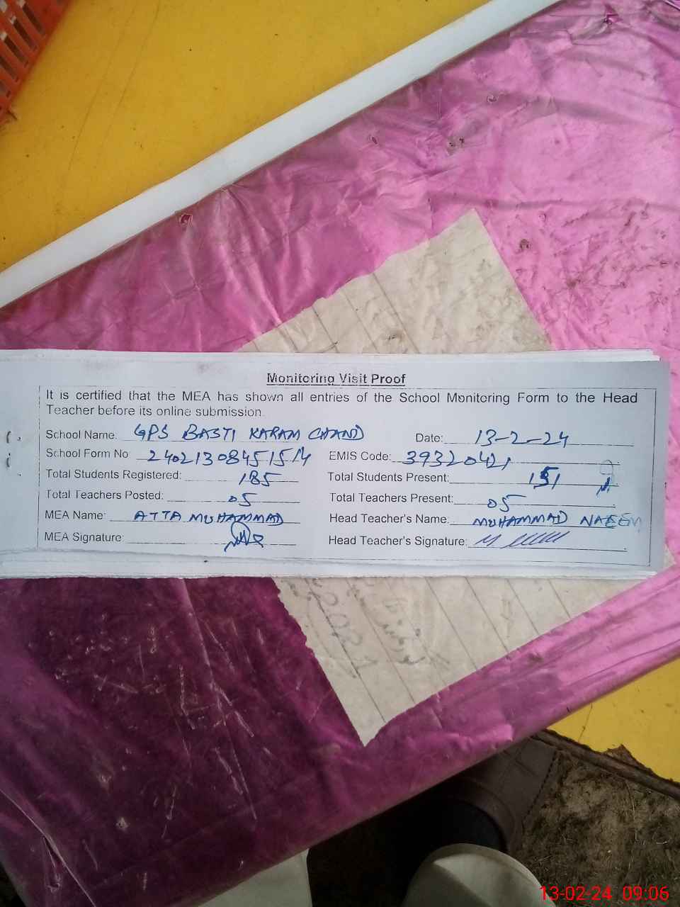 | Attendance Register | Head Teacher | MEA with School | Visit Proof |