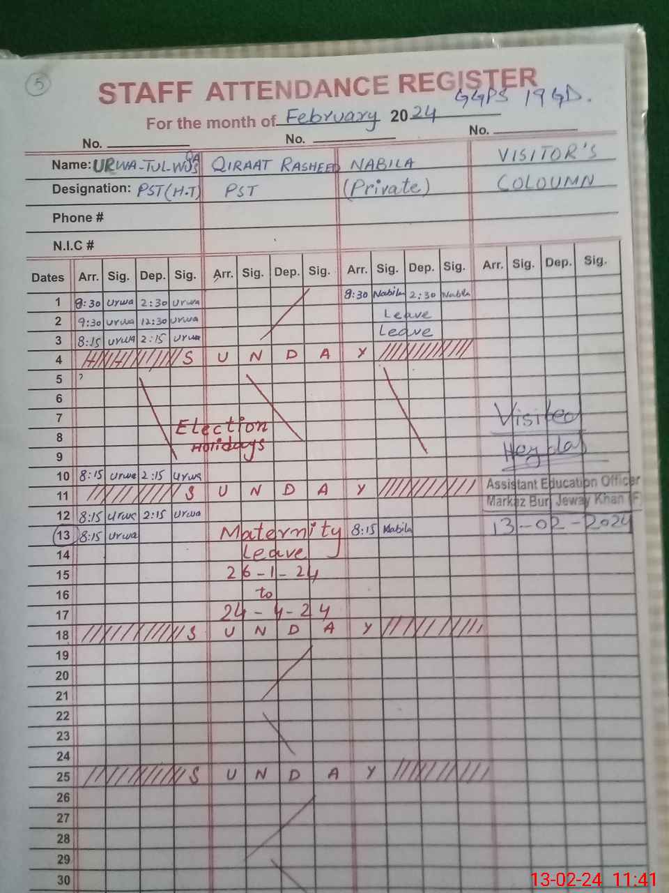 | 35**** | Qi**** Ra**** | PST | Regular | 10 | 0 | 0 | 6 | 0 | 0 | 0 | 0 | 4 | Maternity |