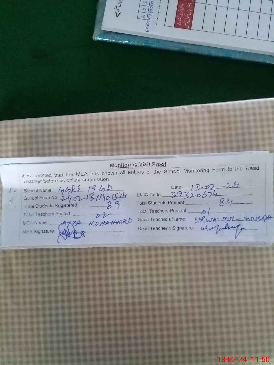 | Attendance Register | Head Teacher | MEA with School | Visit Proof |