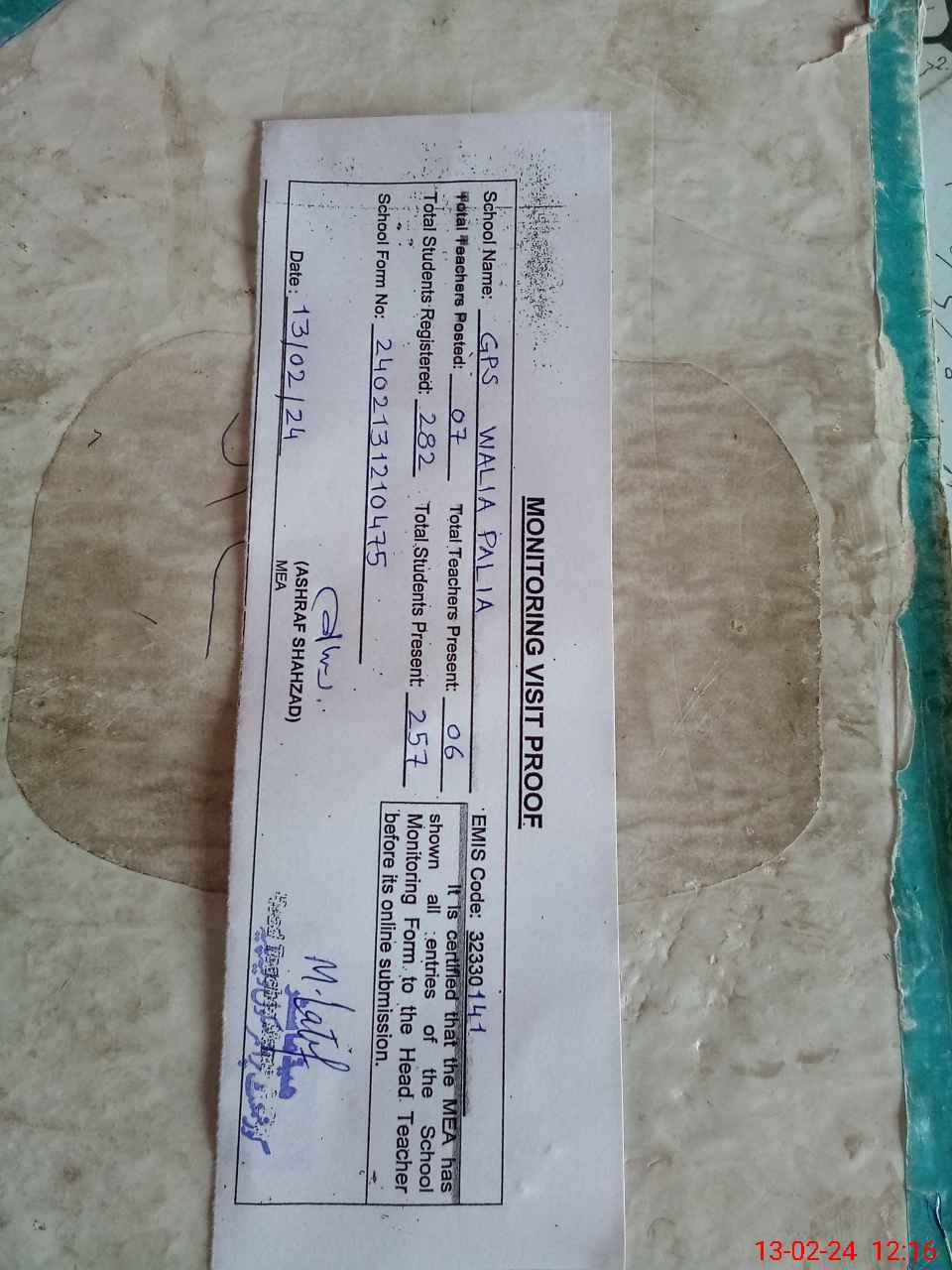 | Attendance Register | Head Teacher | MEA with School | Visit Proof |