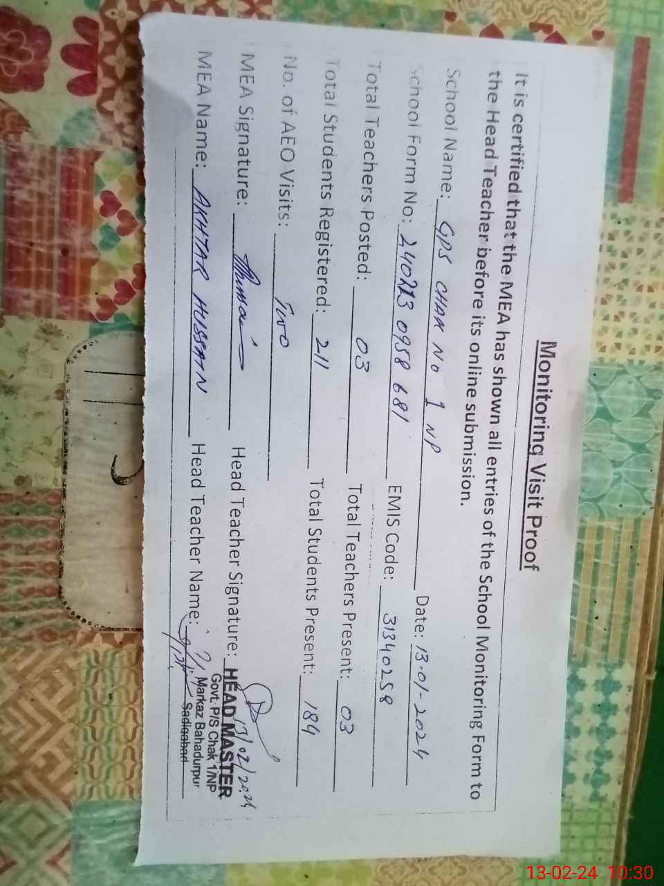 | EMIS Code: 31340258 | Name of School: GPS CHAK NO 1/NP | |||