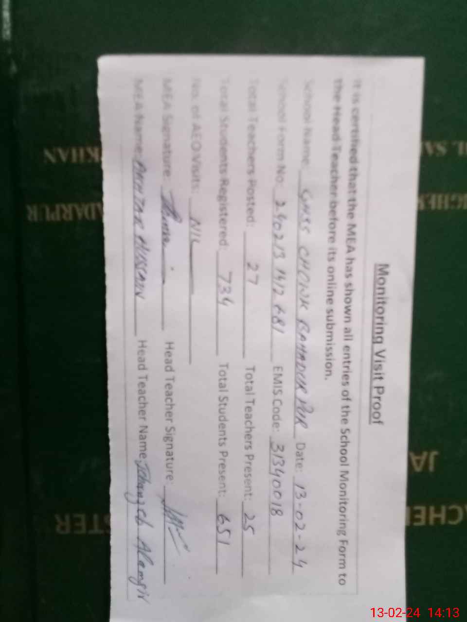 | Attendance Register | Head Teacher | MEA with School | Visit Proof |