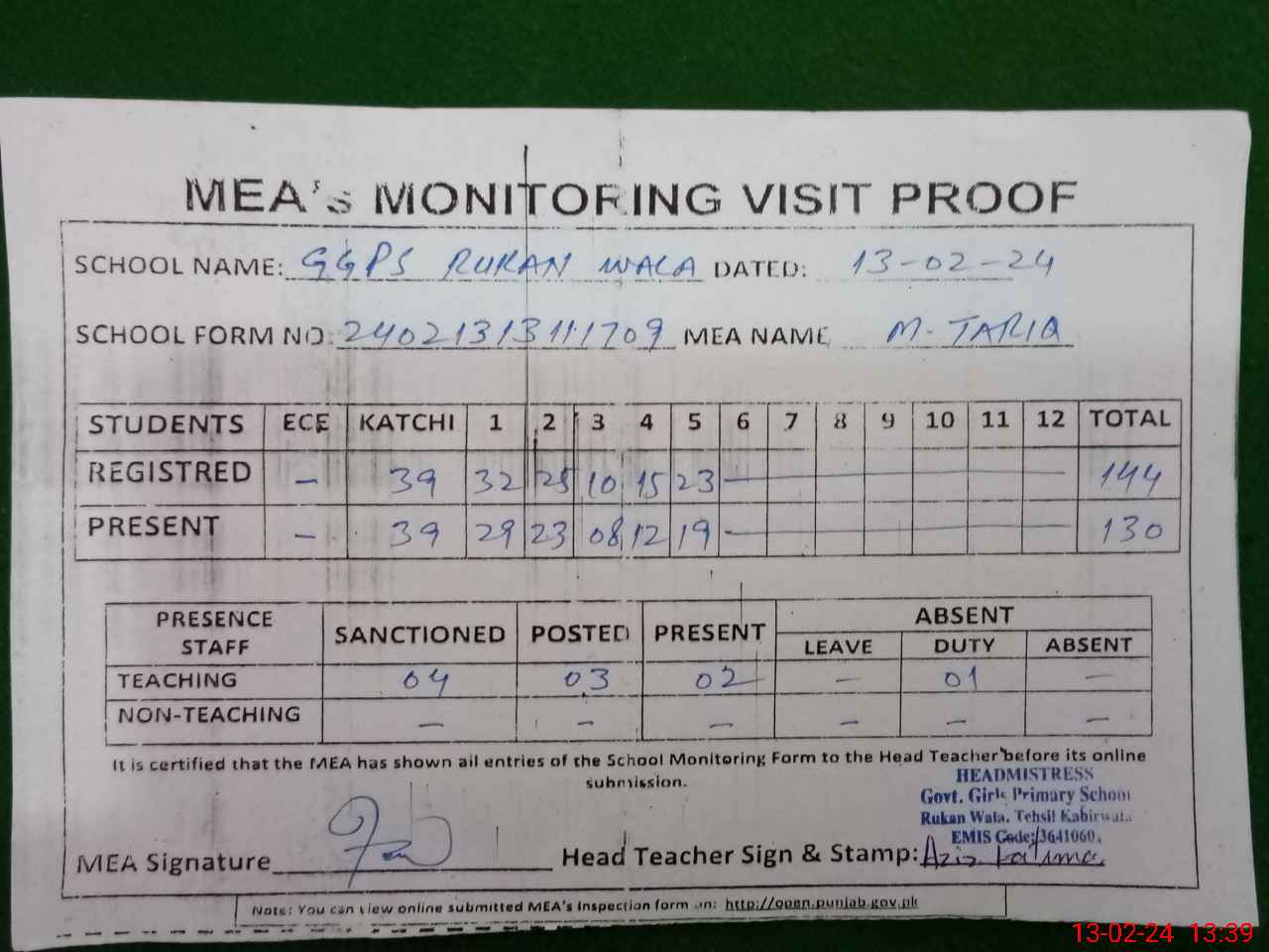| EMIS Code: 36410601 | Name of School: GGPS RUKAN WALA | |||