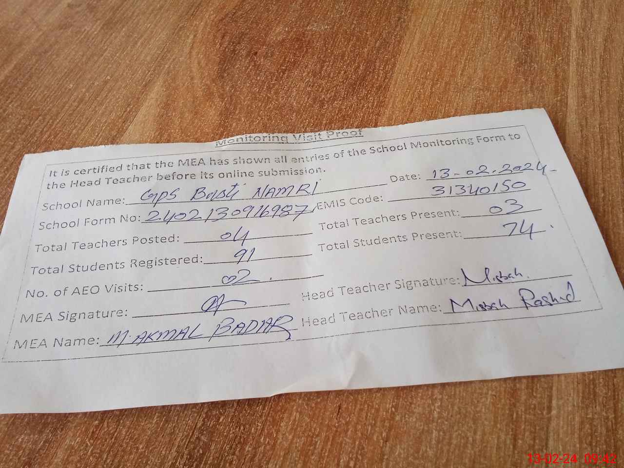 | Attendance Register | Head Teacher | MEA with School | Visit Proof |