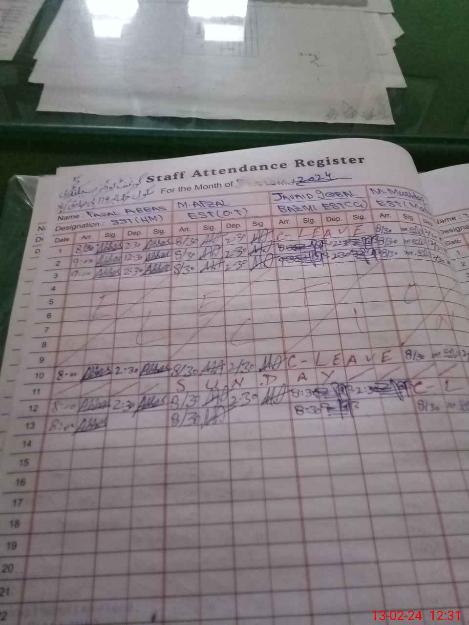 | CNIC | Full Name | Designation | R/C | Absence During Last Calender Month |