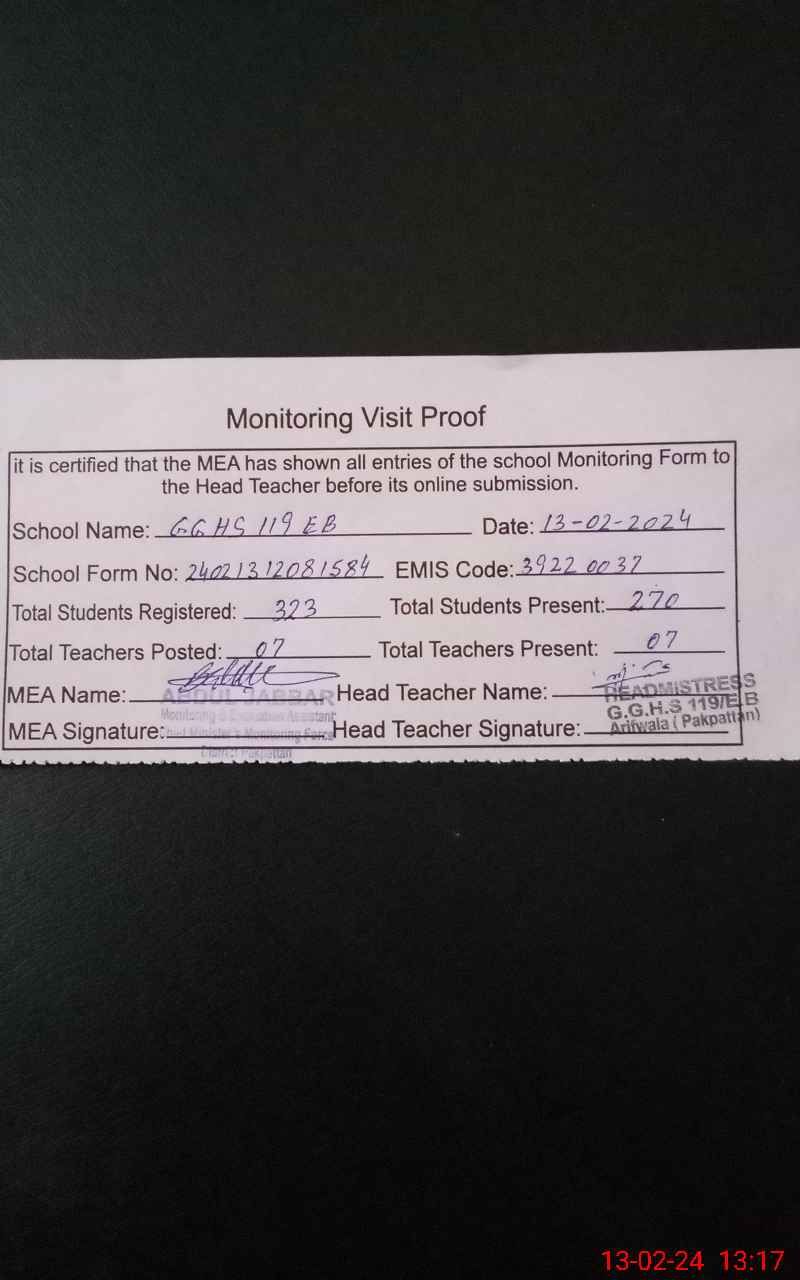 | EMIS Code: 39220037 | Name of School: GGHS 119 EB | |||