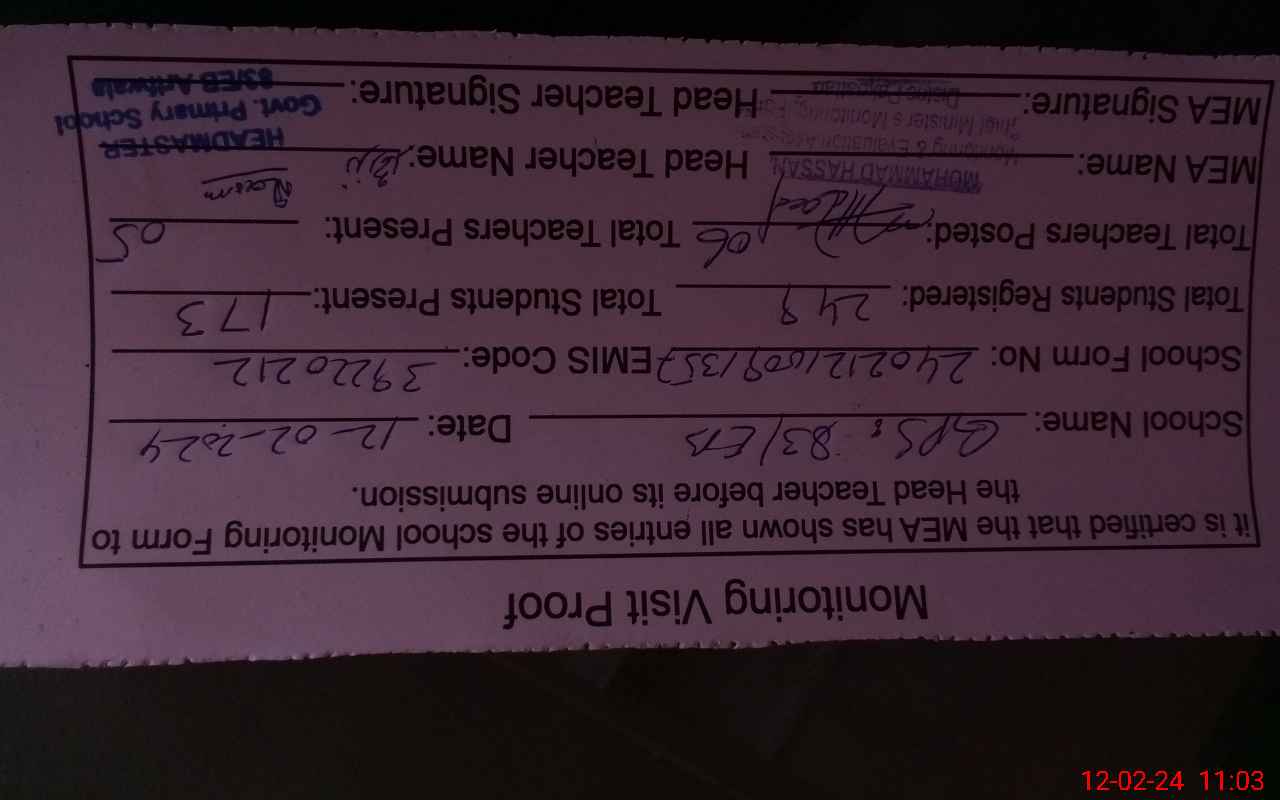 | Certified that this School was Inspected by the Undersigned MEA/DMO Today and the Information Stated Above is as Per Record. | |||||
