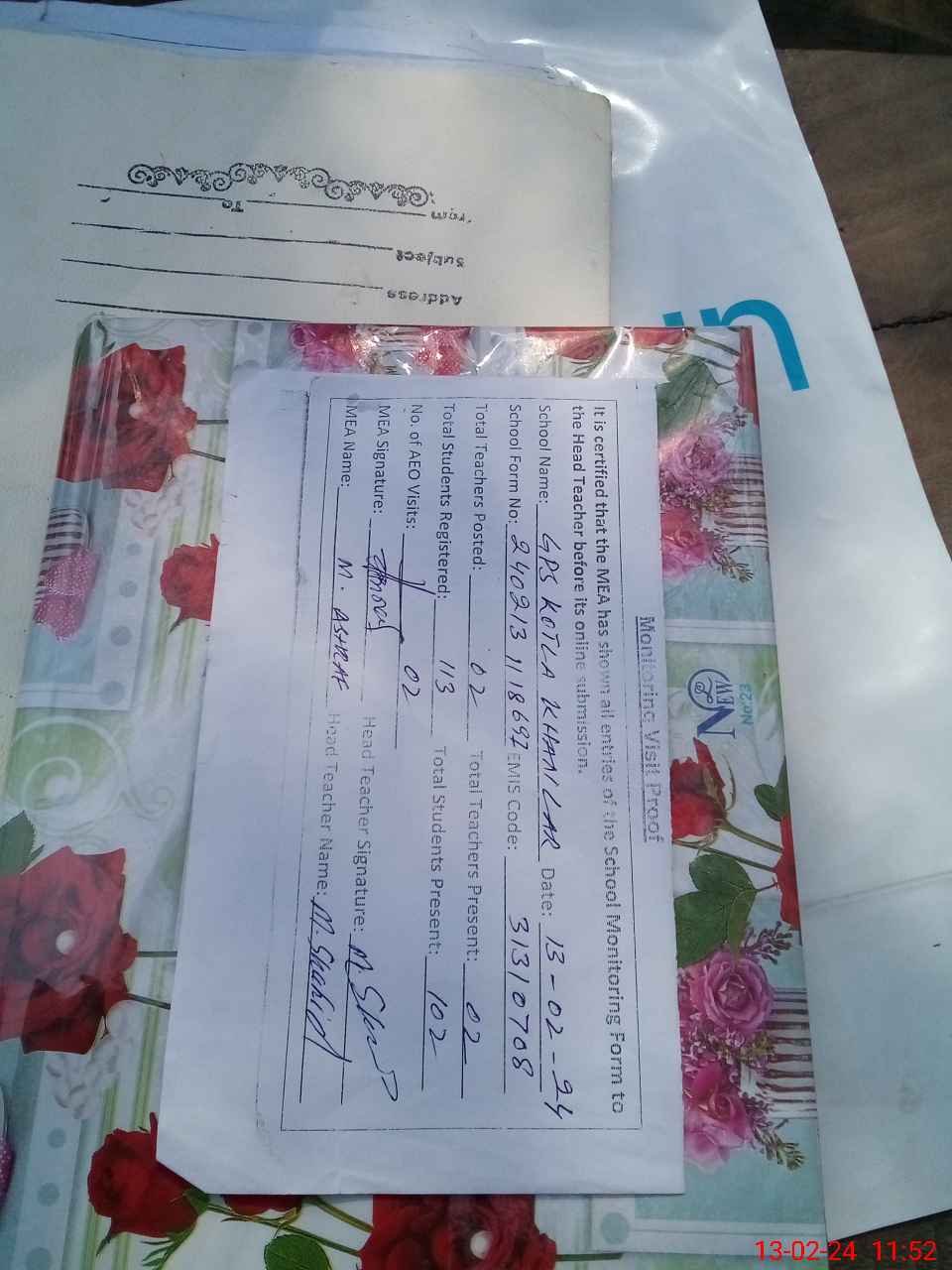 | Attendance Register | Head Teacher | MEA with School | Visit Proof |