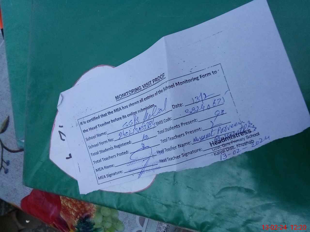 | Attendance Register | Head Teacher | MEA with School | Visit Proof |
