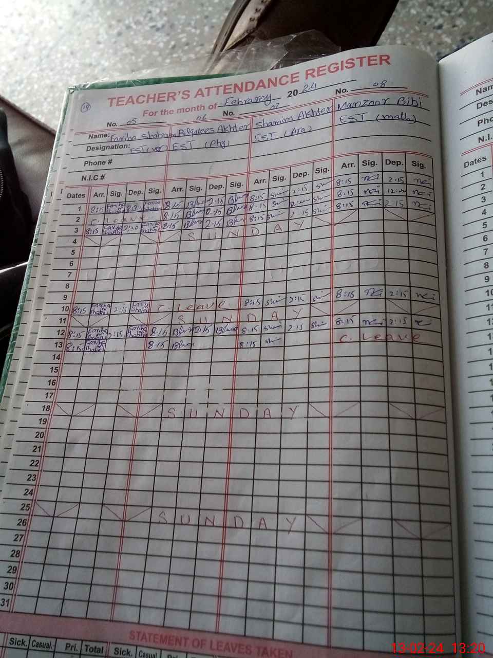 | CNIC | Full Name | Designation | R/C | Absence During Last Calender Month |