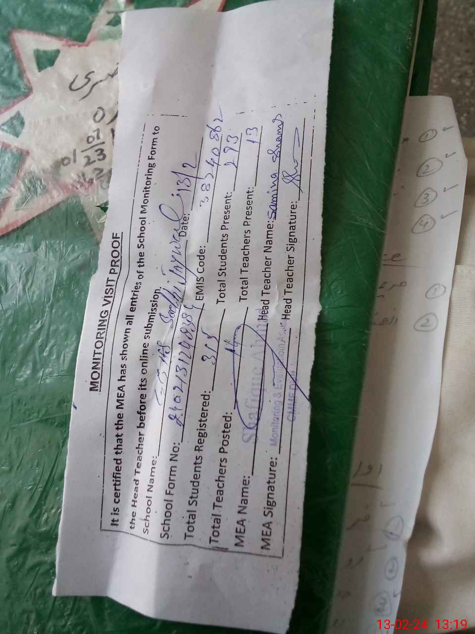 | Attendance Register | Head Teacher | MEA with School | Visit Proof |