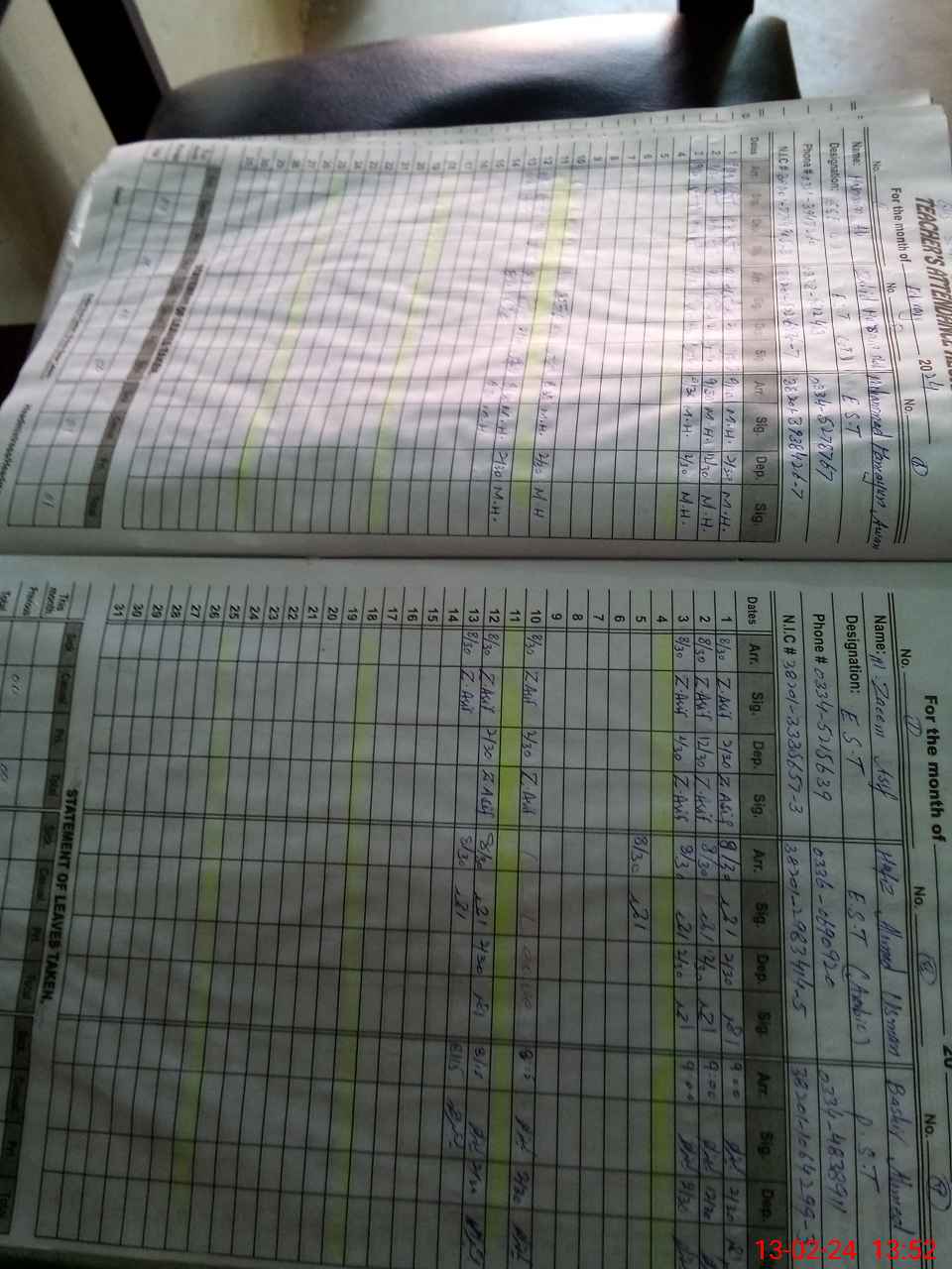 | CNIC | Full Name | Designation | R/C | Absence During Last Calender Month |